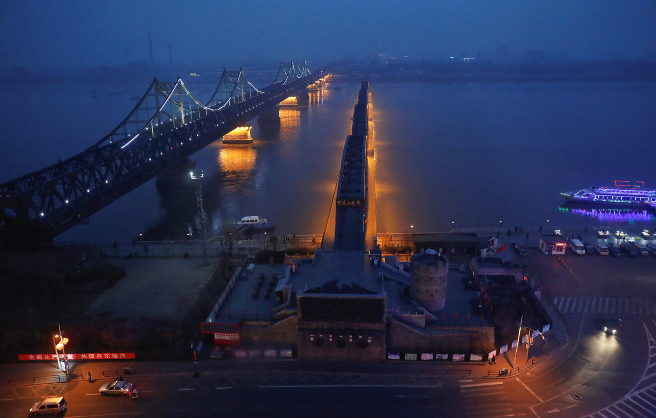 Night View of a Historic Bridge Illuminated Over River