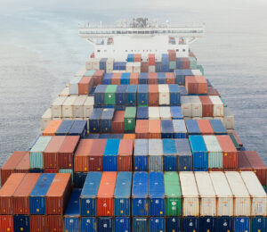 Witness global trade in motion as a mighty cargo ship navigates the vast ocean, symbolizing the interconnectedness of our world.