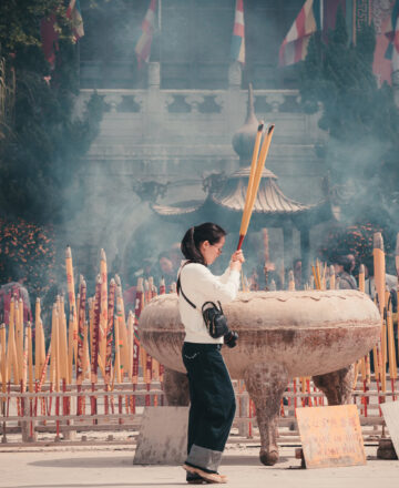 A serene scene of traditional rituals at the temple, where incense offerings fill the air, symbolizing deep devotion and culture.