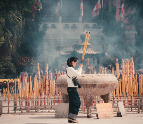 A serene scene of traditional rituals at the temple, where incense offerings fill the air, symbolizing deep devotion and culture.